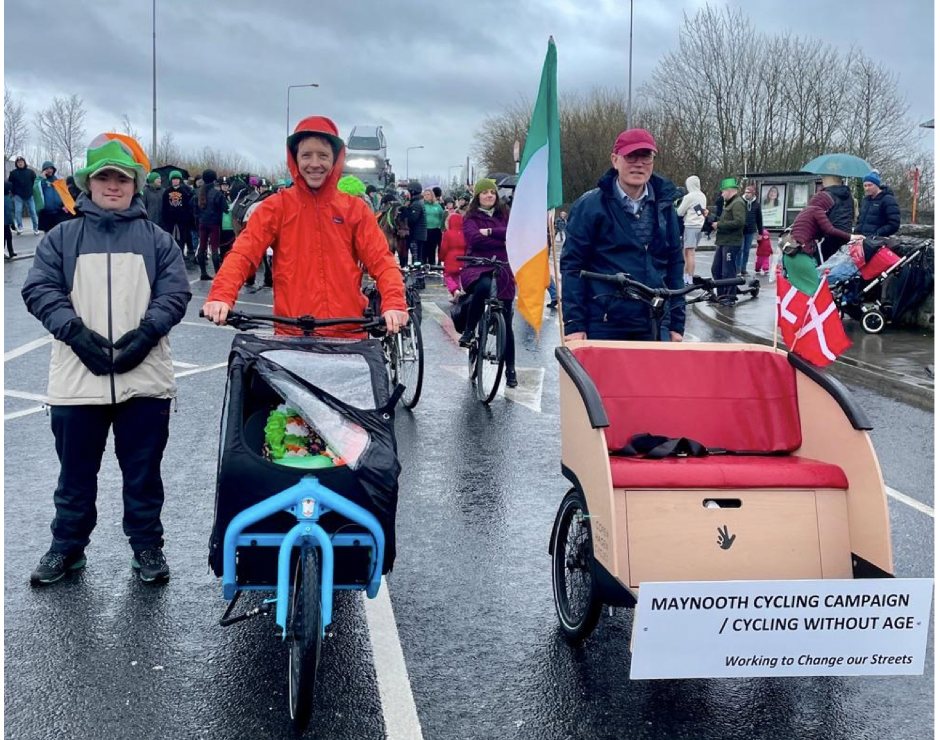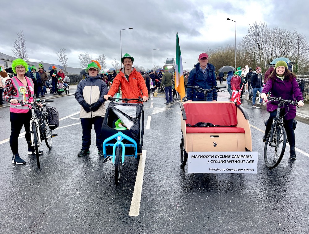 Well, we finally launched the Cycling without Age trishaw in Maynooth at the parade on St. Patricks Day. That was our goal from last September but although we thought that we had everything in hand, there were a number of last minute hickcups which threatened to spoil the occasion but everything fell into place in the final week – apart from the weather.
